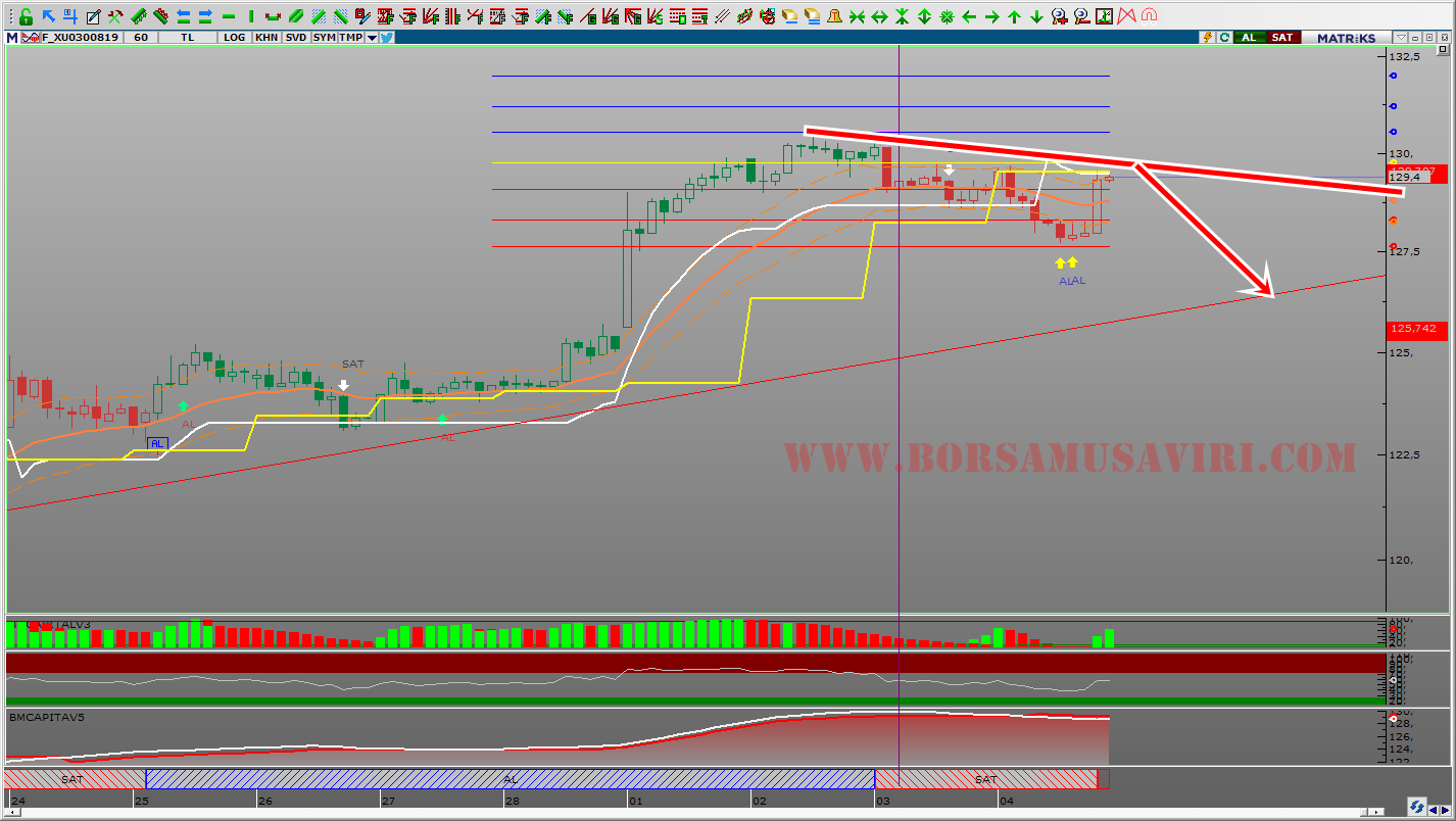 Yükselen kanalın aşağı kırılması ile birlikte vadeli endeks kontratlarında 129.400 seviyesinden satım öngörüsü oluştu.