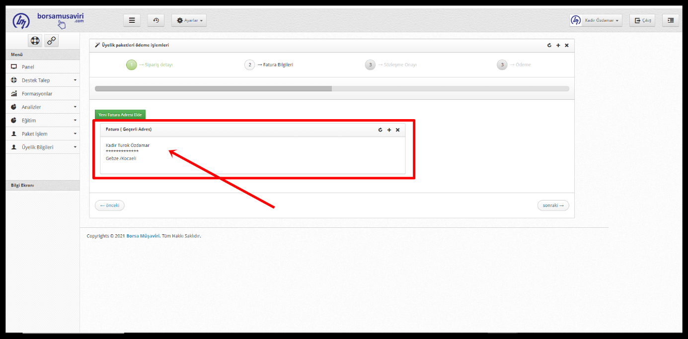Sağ üstte bulunan Kullanıcı adının üzerine gelip tıklayarak(yukarıda ki grafikte Kadir Özdamar yazan yer) kendilerine özel kullanıcı panellerine ulaşacaklardır.