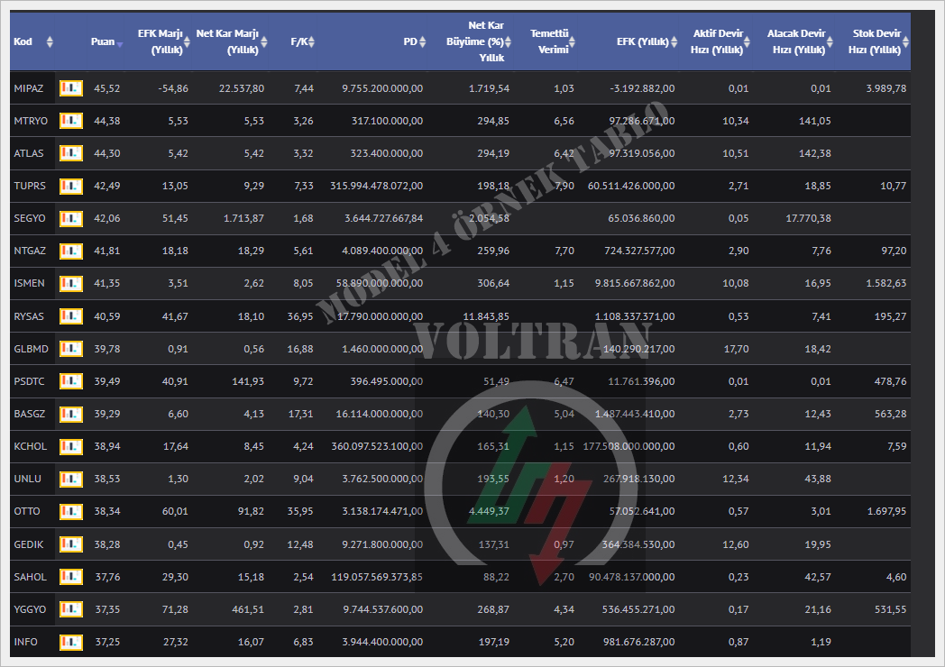 23. Hisse Senedi Puanlaması: Voltran, temel ve teknik analiz verilerini kullanarak hisse senetlerini puanlar. Bu puanlama sistemi, kullanıcılara potansiyel yatırım fırsatlarını daha iyi değerlendirme imkanı tanır.